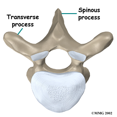 A bony knob projects out at the point where the two lamina bones join together at the back of the spine. You can feel these projections, called spinous processes, as you rub your fingers up and down the middle of your back. Bony knobs also point out from the side of the bony ring, one on the left and one on the right. These projections are called transverse processes.