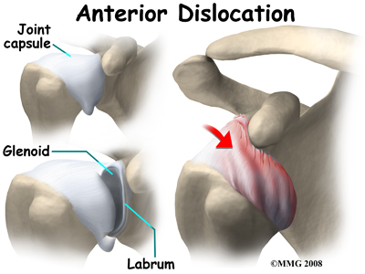 With an anterior dislocation, the head of the humerus is driven forward from inside the glenoid cavity to a place under the coracoid process. This type of dislocation is sometimes referred to as a subcoracoid dislocation. The joint capsule is usually avulsed (torn away) from the margin of the glenoid cavity.