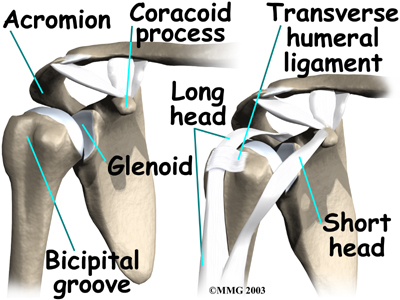 The main proximal tendon is the long head of the biceps. It connects the biceps muscle to the top of the shoulder socket, the glenoid. Beginning at the glenoid, the tendon of the long head of the biceps travels down the front of the upper arm. The tendon runs within the bicipital groove and is held in place by the transverse humeral ligament.