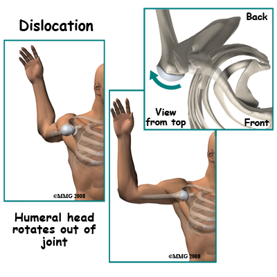 Glenohumeral dislocations result from the shoulder joint (glenohumeral joint) being moved beyond its limits. The most common position causing this dislocation is excessive abduction and external rotation. Simply put, when the level of the elbow is at or above the shoulder level the hand is forced backwards and the shoulder is therefore pushed forward, out of joint, by a "crank-shaft" action. Dislocation backwards also occurs. The humeral head may be fractured or dented from the impact of it hitting the glenoid rim on dislocation. This is very common after an anterior dislocation. This dent is called a Hill Sachs Lesion. Fortunately it is usually small and rarely needs treatment.