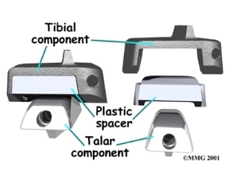 The tibial component is usually made up of two parts: a flat metal piece called a metal tray that is attached directly to the tibia bone, and a plastic cup that fits onto the metal piece, forming a socket for the artificial ankle joint. The talus component is made of metal and fits into the socket of the tibial component.