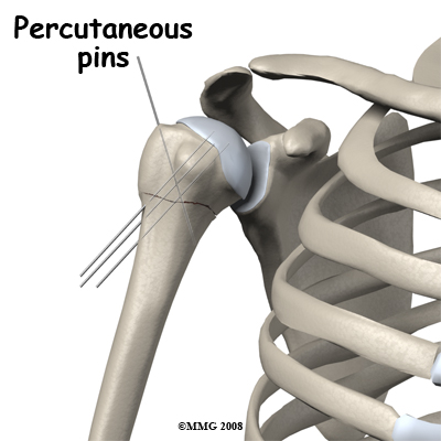 In some fractures of the humeral neck, the fracture is unstable meaning that it is at high risk to displace again after closed reduction. This can be prevented by inserting pins through the skin and across the fracture under x-ray guidance. When the fracture has partly healed, these pins can be removed without the need for an anesthetic.