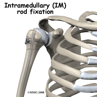 Open Reduction Internal fixation (?ORIF) is often employed for glenoid rim fractures, fractures of the outer end of the clavicle, displaced fractures of the neck of the humerus, fracture dislocations of the shoulder, and for fracture dislocations of the sterno-clavicular joint. ORIF is used less often for fractures of the shaft of the collarbone, glenoid neck, or displaced avulsion fractures of the acromion, coracoid process, distal pole of the scapula or greater tuberosity. Intramedullary (IM) rod fixation is a more complex form of ORIF and is sometimes used for unstable fractures of the neck of the humerus. This form of fixation involves placing a rod down the shaft of the humerus. After most forms of fixation of shoulder fractures, a sling is used for a few weeks to help with pain control and reduce the load on the healing area.