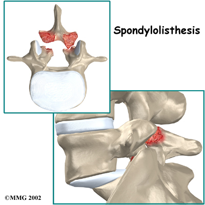 The crack may affect only one side of the bony ring. However, it is equally common for the defect to occur on both sides. When this happens, the vertebra is no longer held firmly in place by the facet joints on the back of the ring. As a result, the vertebra is free to slip forward over the one below. This slippage, which is closely related to spondylolysis, is called spondylolisthesis.