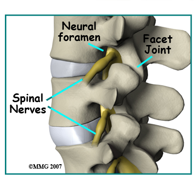 Shrinking disc height also reduces the size of the neural foramina, the openings between each vertebral pair where the nerve roots leave the spinal column. The arthritis also results in the development of bone spurs that may protrude into these openings further narrowing the space that the nerves have to exit the spinal canal. The nerve roots can end up getting squeezed where they pass through the neural foramina.