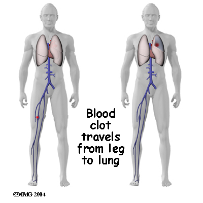 Thrombophlebitis, sometimes called deep venous thrombosis (DVT), can happen after any operation. It occurs when blood in the large veins of the leg forms blood clots. This may cause the leg to swell and become warm to the touch and painful. If the blood clots in the veins break apart, they can travel to the lung, where they lodge in the capillaries and cut off the blood supply to a portion of the lung. This is called a pulmonary embolism. (Pulmonary means lung, and embolism refers to a fragment of something traveling through the vascular system.) Most surgeons take preventing DVT very seriously. There are many ways to reduce the risk of DVT, but probably the most effective is getting you moving as soon as possible after surgery. Two other commonly used preventative measures include