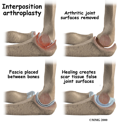 Before the invention of high-quality artificial joints, surgeons used many techniques to keep the bone surfaces of arthritic joints from rubbing against each other. One of these techniques is distraction interposition arthroplasty. This procedure involves placing a piece of tendon or fascia between the bony surface of the elbow joint. (Fascia is a connective tissue, similar to tendon, that lies in a flat sheet. It covers the muscles and acts as a divider between different compartments of the body.)