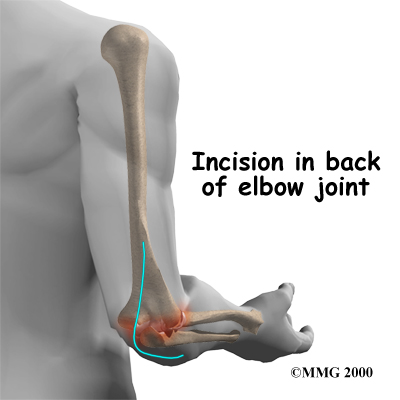 The first step in an elbow fusion is an incision down the back of the elbow. The incision is made on the back side because most of the blood vessels and nerves are on the inside of the elbow. Entering through the back of the elbow makes them less likely to be damaged.