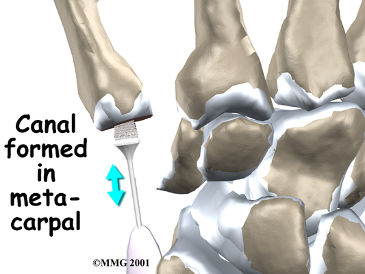 A burr (a small cutting tool) is used to make a canal into the bones that form the thumb joint. The surgeon sizes the stem of the prosthesis to ensure a snug fit into the canal and inserts it. When the new joint is in place, the surgeon wraps the joint with a strip of nearby tendon. This gives the new implant some added protection and stability.