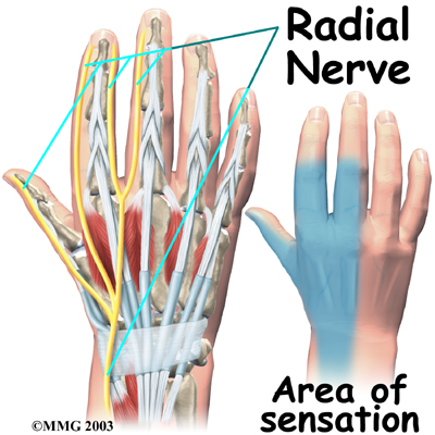 The radial nerve runs along the thumb-side edge of the forearm. It wraps around the end of the radius bone toward the back of the hand. It gives sensation to the back of the hand from the thumb to the third finger. It also supplies the back of the thumb and just beyond the main knuckle of the back surface of the ring and middle fingers.