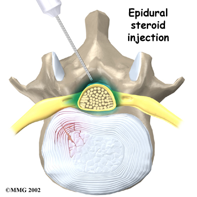 Some patients who continue to have symptoms are given an epidural steriod injection (ESI). Steroids are powerful anti-inflammatories. In an ESI, medication is injected into the space around the lumbar spinal nerves where they branch off of the spinal cord. This area is called the epidural space. Some doctors inject only a steroid. Most doctors, however, combine a steroid with a long-lasting numbing medication. Generally, an ESI is given only when other treatments aren't working. But ESIs are not always successful in relieving pain. If they do work, they often provide only temporary relief.