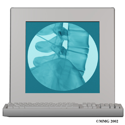 A diagnostic injection may be used to locate the source of pain. The doctor uses a long needle to inject a local anesthetic (numbing medication) into either the joint or into the nerve that goes to the joint. The doctor watches the needle on a fluoroscope to make sure it reaches the correct spot. A fluoroscope is a special X-ray television that allows the doctor to see your spine and the needle as it moves. Once the doctor is sure the needle is in the right place, the medicine and a special dye are injected. The doctor watches the dye to make sure the medication is correctly placed. The results from the injection help the doctor make the diagnosis. If pain goes away, it helps confirm the source of pain.