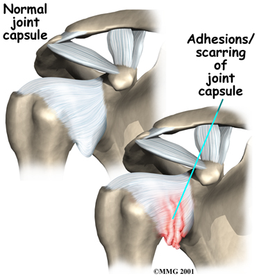 As the name suggests, adhesive capsulitis affects the fibrous ligaments that surround the shoulder forming the capsule. The condition referred to as a frozen shoulder usually doesn't involve the capsule. Secondary adhesive capsulitis (or true frozen shoulder) might have some joint capsule changes but the shoulder stiffness is really coming from something other than the joint capsule. Some of the conditions associated with secondary adhesive capsulitis include rotator cuff tears, biceps tendinitis, and arthritis. In either condition, the normally loose parts of the joint capsule stick together. This seriously limits the shoulder's ability to move, and causes the shoulder to relatively freeze.