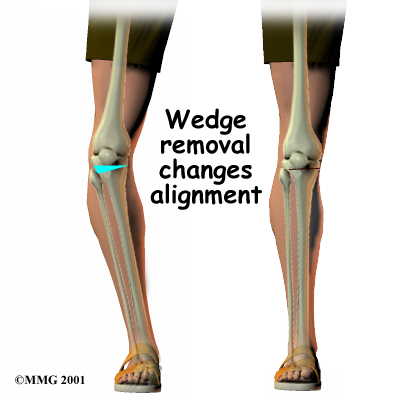There are two methods to realign the knee joint. One involves taking out a wedge of bone; the other involves adding a wedge of bone. Any operation for cutting through a bone is called an osteotomy. In a closing wedge osteotomy, the surgeon cuts though the tibia on the lateral side, removes a wedge of bone, and pins the open edges together. In an opening wedge osteotomy, the surgeon cuts though the tibia on the medial side and opens a wedge, adding a bit of bone graft to hold the wedge open.