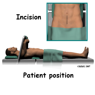 The new system is placed in the spine through an incision though the abdomen or belly. Working from the front of the spine through the abdomen, the organs are carefully moved to one side. This makes it easier to see the front of the spine. The spine surgeon removes a large section from the middle of the damaged disc.