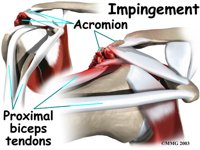 In shoulder impingement, the soft tissues between the humeral head and the top of the shoulder blade (acromion) get pinched or squeezed with certain arm movements. This pain affects the way you move your shoulder, and often the biceps muscle is overused to compensate or is physically pinched which causes it to become inflamed.