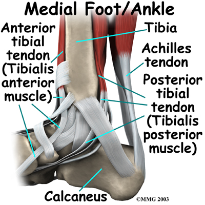 The ankle joint is also supported by nearby tendons. The large Archilles tendon is the most important tendon for walking, running, and jumping. It attaches the calf muscles to the calcaneus (heelbone) and allows us to raise up on our toes. The posterior tibial tendon attatches one of the smaller muscles of the calf to the underside of the foot. This tendon helps support the arch and allows us to turn the foot inward.