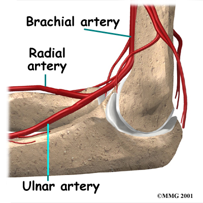 Traveling along with the nerves are the large vessels that supply the arm with blood. The largest artery is the brachial artery that travels across the front crease of the elbow. If you place your hand in the bend of your elbow, you may be able to feel the pulsing of this large artery. The brachial artery splits into two branches just below the elbow: the ulnar artery and the radial artery which both continue into the hand. Damage to the brachial artery can be very serious because it is the only blood supply to the hand.