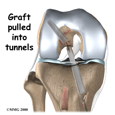 Once this is done, holes are drilled in the tibia and the femur to place the graft. These holes are placed so that the graft will run between the tibia and femur in the same direction as the original ACL.