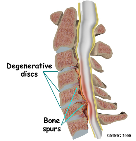 Degeneration is the most common cause of spinal stenosis. Wear and tear on the spine from aging and from repeated stress and strain can cause many problems in the cervical spine. The intervertebral disc can begin to collapse, shrinking the space between vertebrae. Bone spurs may form that protrude into the spinal canal and reduce the space available to the spinal cord. The ligaments that hold the vertebrae together may become thicker and can also push into the spinal canal. All of these conditions narrow the spinal canal.