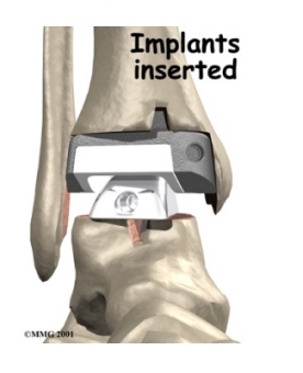 When the surgeon feels that everything is satisfactory, the joint capsule is sewn back together, and the skin is stitched together. A large bandage and splint are placed on the lower leg to protect the new ankle joint as your leg heals.
