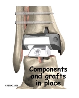 Bone is grafted between the fibula and tibia to create a fusion between them. This stops any motion between the two bones that could loosen the artificial joint. The bone graft is taken from the bone that was removed from the ankle earlier during the shaping procedure.