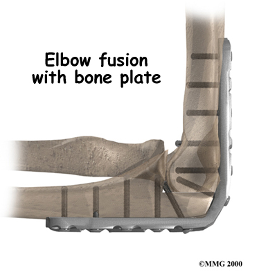 There are many different types of operations to fuse the elbow. Most of the procedures are designed to remove the articular cartilage from the joint surfaces of the hinge joint and then bind the two surfaces together until they heal. When two raw bone surfaces are held together like this, your body treats them like a broken bone. New bone forms to heal the two pieces together. When the fusion is healed, a strong, solid connection between the humerus and ulna will have replaced the painful arthritic joint.