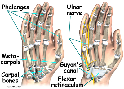 This tunnel is formed by two bones (the pisiform and hamate) and the ligament that connects them. After passing through the canal, the ulnar nerve branches out to supply feeling to the little finger and half the ring finger. Branches of this nerve also supply the small muscles in the palm and the muscle that pulls the thumb toward the palm.
