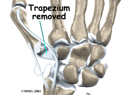 Next, the joint capsule surrounding the CMC joint is opened. The surgeon takes out (excises) the trapezium bone at the base of the thumb.