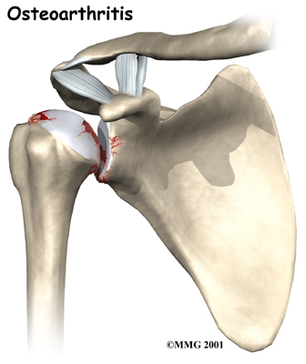The most common reason for undergoing shoulder replacement surgery is osteoarthritis. Osteoarthritis is caused by the degeneration of the joint over time, through wear and tear. Being that the shoulder is not a weight-bearing joint, it does not suffer as much wear and tear as other joints such as the weight-bearing hip and knee joints. Although osteoarthritis in the shoulder can occur without any causative injury to the shoulder, this is uncommon; usually it is a subsequent result of another injury or disease in the shoulder joint.