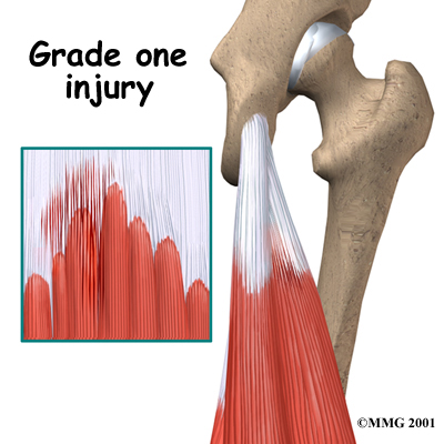 Grade one injuries are muscle pulls that do not result in much damage to the structure of the tissues. Grade two injuries are partial tears. Grade three injuries are complete tears.