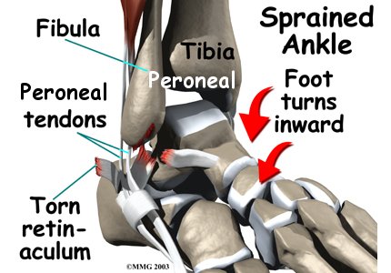 The main cause of peroneal tendon subluxation is an ankle sprain. A sprain that injures the ligaments on the outer edge of the ankle can also damage the peroneal tendons. During the typical inversion ankle sprain, the foot rolls in. The forceful stretch on the peroneals can rip the retinaculum that keeps the peroneal tendons positioned in the groove. As a result, the tendons can jump out of the groove. The tendons usually relocate by snapping back into place.