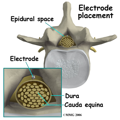 Placement of temporary wires for the trial is a minimally invasive procedure. An epidural needle is placed through the skin and into the spinal canal near the spinal cord. This is done with the help of a special X-ray called fluoroscopy. The electrode wires are then inserted through a needle and pushed through the spinal canal until they are in the right position. The wires are then attached to the external stimulator device. Your surgeon will adjust the wires and tune the stimulator. When satisfied with the placement of the wires, a stitch to your skin is used to keep the electrode wires in place for the trial period. You are able to adjust the strength of the electrical stimulation and turn it off and on using the external device. When the stimulator is on, you should feel a tingling sensation that covers the area of your pain.