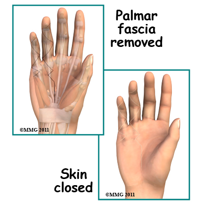Many cases of Dupuytren's contracture progress to the point where surgery is needed. The goal of surgery is to remove the diseased fascia, allowing the finger to straighten out again. By removing the tight cords and fascia, the tension on the finger is released. Once the fibrous tissue is removed, the skin is sewn back together with fine stitches.