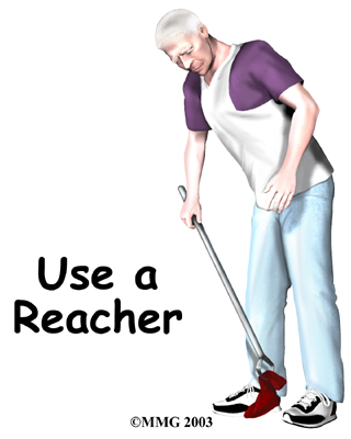 - Instead, use a reacher to put on your shoes and socks or to pick up items from the floor.