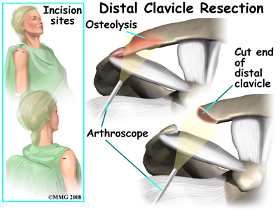 Surgery may be needed for those athletes who do not improve with conservative care or who are unwilling to change their training or performance routine. The surgeon removes the end of the clavicle. This is called a distal clavicle resection. The procedure can be done with an open incision or through tiny athroscopic puncture holes.