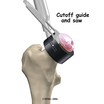 The operation begins by making an incision in the side of the thigh. This allows the surgeon to see both the femoral head and the acetabulum (or socket). The femoral head is then dislocated out of the socket. Special powered instruments are used to shape the bone of the femoral head so that the new metal surface will fit snugly on top of the bone.