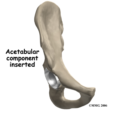 The hip socket may remain unchanged but more often it is replaced with a thin metal cup. A special tool called a reamer is used to remove the cartilage from the acetabulum and shape the socket to fit the acetabular component. Once the shape is correct, the acetabular component is pressed into place in the socket. Friction holds the metal liner in place until bone grows into the holes in the surface and attaches the metal to the bone.