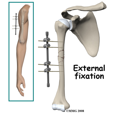 With external fixation, strong metal pins are inserted into the bone fragments above and below the fracture.
