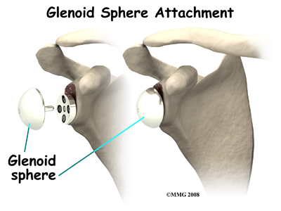 The glenoid will be replaced with a ball of metal. The arthritic glenoid surface is prepared by grinding away any remaining cartilage and flattening the surface. This is done with an instrument called a reamer. The surgeon usually uses the reamer to drill holes into the bone of the scapula and to flatten the deformed glenoid surface so the base plate rests on a smooth, flat surface. This is where the stem of the glenoid component is anchored.