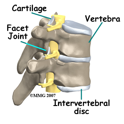 Discs are fluid-filled cushions between the vertebrae. Facet joints are small joints connecting each vertebra in the back that allow movement. Facet joints are lined with cartilage. The cartilage is a covering of the joint surface that gives some cushion and protects the bone. It is also slippery which helps with motion.