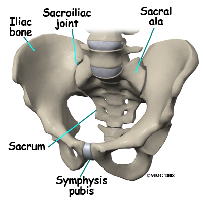At the top of the sacrum there are wings from each side called the sacral ala. At the ala, the sacrum fits between the two halves of the pelvis. These pelvic bones are called the iliac bones. This is where the sacroiliac joints are formed. Most everyone has two dimples in their low back where the sacroiliac joints form. These three bones of the pelvis, the sacrum and the two iliac bones, make a ring.