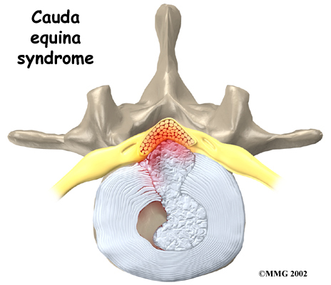Rarely, symptoms involve changes in bowel and bladder function. A large disc herniation that pushes straight back into the spinal canal can put pressure on the nerves that go to the bowels and bladder. The pressure may cause low back pain, pain running down the back of both legs, and numbness or tingling between the legs in the area you would contact if you were seated on a saddle. The pressure on the nerves can cause a loss of control in the bowels or bladder. This is an emergency. If the pressure isn't relieved, it can lead to permanent paralysis of the bowels and bladder. This condition is called cauda equina syndrome. Doctors recommend immediate surgery to remove pressure from the nerves.