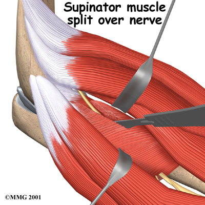 Soft tissues are gently moved aside so the surgeon can check the places where the radial nerve may be getting squeezed within the radial tunnel. The nerve can be pinched in many spots, so it is important to check all the areas that may be causing problems. Any parts of the tunnel that are pinching the nerve are cut. This expands the tunnel and relieves pressure on the nerve. At the end of the procedure, the skin is stitched together.