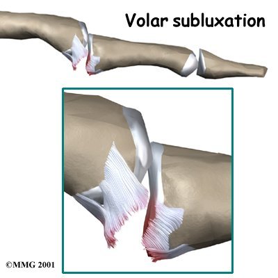 Injury to the volar plate can occur when the joint is hyperextended. If a complete tear occurs, the ligament usually ruptures or tears from its attachment on the middle phalanx.