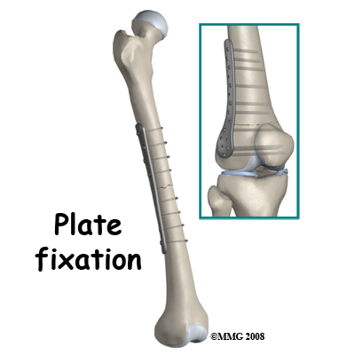 When the fracture extends far down the shaft towards the knee a plate may be used. The greatest advantage of operative treatment of a fractured femur is that it allows the patient freedom to move, to walk on crutches very soon after the surgery and to leave the hospital early. The bone is not healed by the surgery, but it is held still to improve the chances of healing. The quicker recovery of normal movement of the hip and knee prevents future problems of stiffness and weakness.