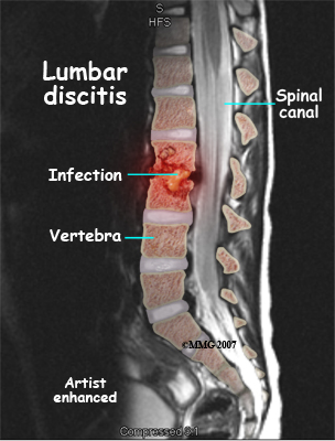 With discitis, the disc will appear narrowed on an X-ray or an MRI. Discitis usually occurs in children less than five years old.