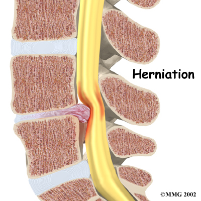 Disc herniation: Spinal stenosis can occur when an intervertebral disc in the low back herniates (ruptures). Normally, the shock-absorbing disc is able to handle the downward pressure of gravity and the strain from daily activities. However, if the pressure on the disc is too strong, such as landing from a fall in a sitting position, the nucleus inside the disc may rupture through the outer annulus and squeeze out of the disc. This is called a disc herniation. If an intervertebral disc herniates straight backward, it can press against the nerves in the spinal canal, causing symptoms of spinal stenosis.