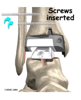 To make sure that the ankle socket or the tibial component fits tightly, two screws are placed through the fibula and the tibia just above the artificial ankle joint.