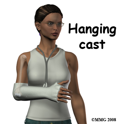 This fracture can often be treated in a cast. The most common type of cast used is the hanging cast. This cast is applied with the elbow bent at a right angle. The cast goes from above the elbow to the knuckles and prevents movement of the elbow, forearm and wrist, leaving the fingers and thumb free to wiggle.